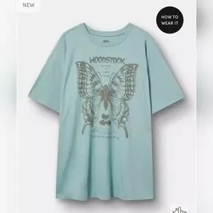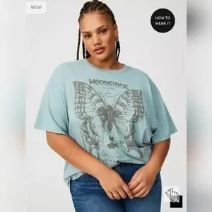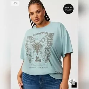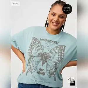 Embrace a vintage vibe with this Woodstock graphic tee. Featuring a striking butterfly design, this blue top is perfect for casual outings. Pair it with your favorite jeans for a relaxed look.