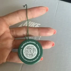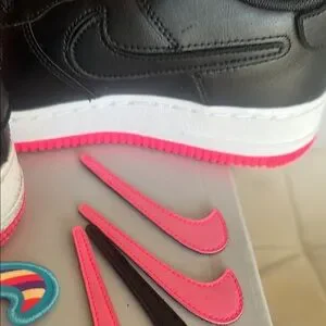 Black and pink Nike Air Force One. All the accent pieces Velcro on, such a fun shoe! you could either have the pink or black swish, and the part on the back also Velcros off and is interchangeable. They are size youth 6 which is equivalent to a woman’s 7.5-8 .. great condition! I also have the verified authentic tag