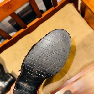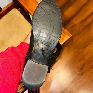 Stylish black leather riding boots. Features buckle accents and side zippers. Perfect for any outfit.