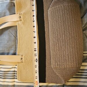 Beautiful and versatile The Sak crochet tote bag in a gorgeous neutral colorblock design. Features beige, black, and taupe/gray tones with sturdy cream straps and a secure zip closure. Perfect everyday bag – lightweight yet roomy enough for all your essentials. Classic The Sak quality with boho-chic vibes.