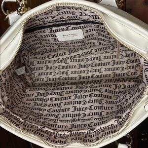 Chic Juicy Couture handbag in light blue denim . Features white script and gold chain detail.