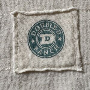 Cream 100% cotton tee shirt top with extra style from Double D Ranch! This top has fringe around the lower part of the cold shoulder sleeves. The neckline and cold shoulder cut out is trimmed in light green and embellished with beads. The main graphic on the front is 3 Native American Indians. This shirt is in great condition and has only 2 small stains on the bottom front near the Double D Ranch logo tag. They aren’t noticeable but looking closely you will see them in the next to last picture.