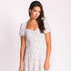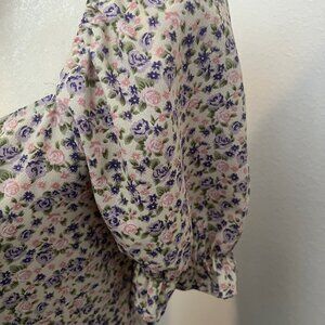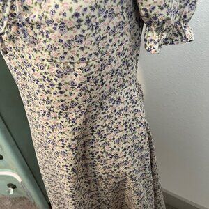 Bought from a boutique in Nashville. Pink ripple brand. Size large. Cream, pink, and purple floral boho cottage core summer dress. A-line. Sweetheart neckline, ruched bodice with tie bow, puffed sleeves, and zipper up the back. Really light and comfortable. Great on its own for summer, great with a denim jacket for spring and fall.