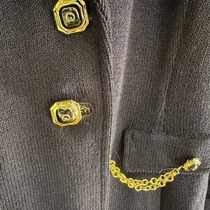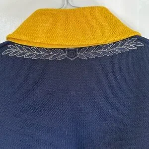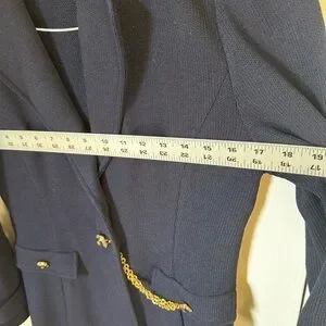 Elegant dark blue blazer featuring bold gold accents. Ideal for a sophisticated look.