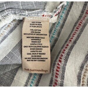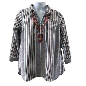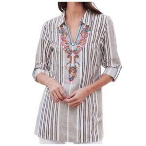This Soft Surroundings tunic boasts a sophisticated striped pattern with vibrant embroidery, offering a perfect blend of comfort and style. Ideal for a polished yet relaxed look.