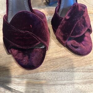 Tory Burch Maroon Velvet Studded Heels. These stylish heels feature a rich maroon velvet upper and a block heel embellished with an assortment of gold tone studs, adding a touch of edgy elegance. The faux wood heels are scratch fee and the velvet is in clean condition. There are some “toe” imprints in the velvet toe box consistent with not new shoes. Soles are leather and show wear consistent with normal prior use. Bottom of heels are dirty but not worn down.