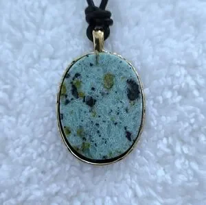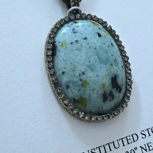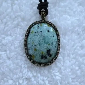 Large, oval shaped, turquoise🩵-green💚, reconstituted stone with yellow💛 and black🖤 speckles is surrounded by gunmetal colored rhinestones💎 and is hung on an adjustable, black🖤 waxed cord