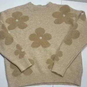 Chic cream sweater with large floral patterns. Cozy and stylish for everyday wear.