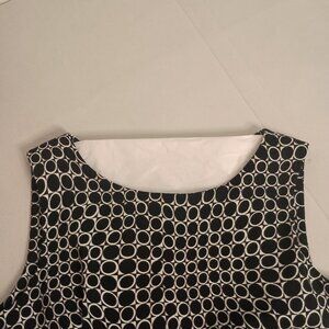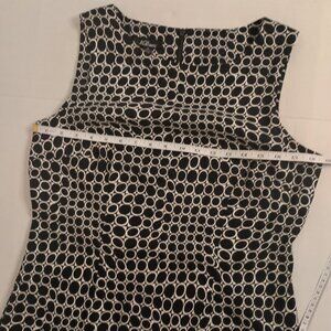 Chic and versatile AGB black and white sleeveless sheath dress featuring a bold circle print design. This timeless piece is perfect for the office, special occasions, or everyday style. Designed with a flattering tailored fit, it offers an elegant yet comfortable look. Excellent choice for workwear, cocktail parties, or layering with a blazer. Preowned and in very good condition with no flaws noted. Perfect work dress.