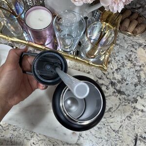 Stylish black water bottle with a gold castle design. Features a convenient lid and a heart detail.