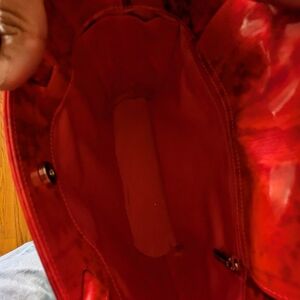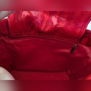 This beautiful Escada Tote is made out of a Patent Leather material, and comes in Red color / Animal Print pattern. Styling includes dual top handles with inset magnetic flap top closure. Escada signature fob. Fabric lined interior compartment with one zip-closure sidewall pocket, and one slip sidewall pocket. Truly a gorgeous Escada Tote! Guaranteed to make an excellent addition to your Designer wardrobe!