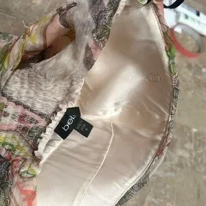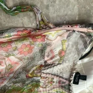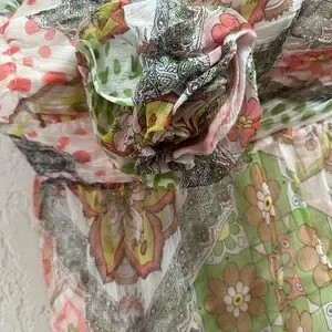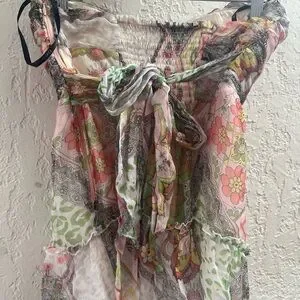 Vibrant strapless top with floral and geometric designs. Features pink, green, and silver hues.