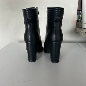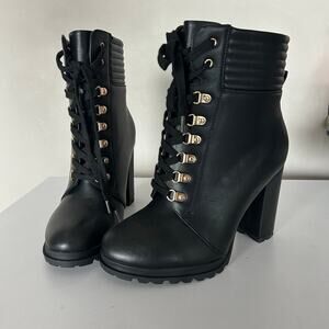 Perfect boots for this winter season ladies! Lace up, lug sole high heel boots with plenty of grip and very comfortable. These run a tad large, perfect for wearing socks without being too tight. Very comfortable for wide calves as well. Making room in my closet so unfortunately these need to go to a new home. Like- new condition!