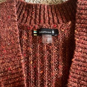 Smartwool cardigan sweater. Great fall colors. Very cozy, warm sweater. Not itchy. 65% Merino wool 30% nylon 5% alpaca