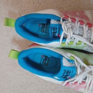 Timberland 10M women's composite toe safety shoe. Some scuffing, as pictured. Small tear in the fabric on the inside of the left heel, as pictured. White with pink, green, blue. Safety toe, slip resistant.