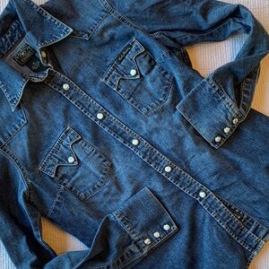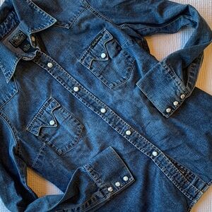 Classic blue denim shirt. Features button-up design. Ideal for everyday style.