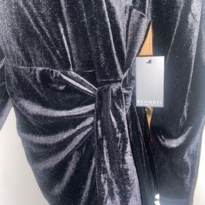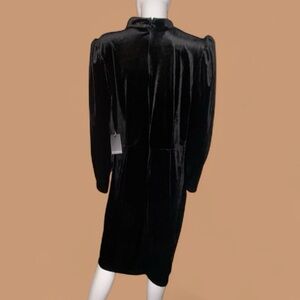 Chic black velvet dress with long sleeves. Features elegant draping. Perfect for evening wear.