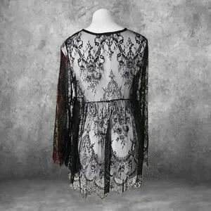 Chic black lace blouse with intricate patterns and long sleeves. Perfect for sophisticated events.