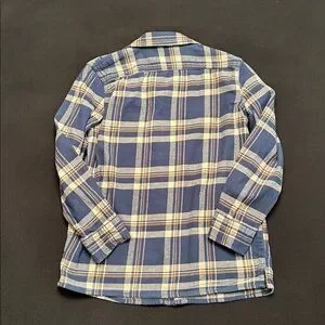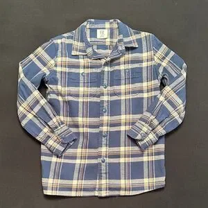 Classic plaid flannel shirt with blue and beige tones. Ideal for everyday comfort. Flannel is nice and thick. Great over a t-shirt as a jacket. Boys size small (6-7). Excellent condition!