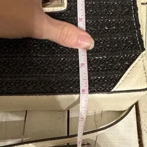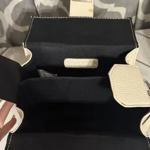 Elegant crossbody with textured black design. Cream accents and silver clasp. Ideal for daily wear. 50” shoulder strap. Has some glue showing around the edging (see pics). Has several spots of glue. Didn’t photo all of the spots