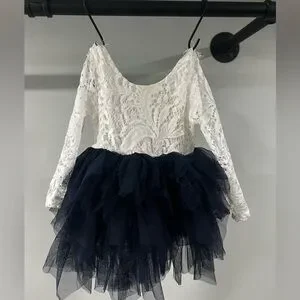 This beautiful baby girl dress features a delicate lace top and a layered tulle skirt. Perfect for special occasions, it combines elegance with comfort. The white lace and blue tulle create a classic look that your child will love.