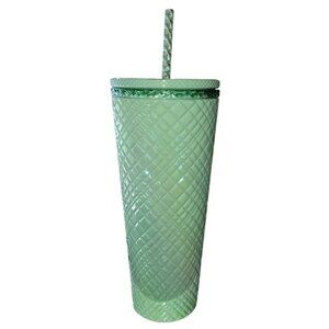 This Starbucks tumbler features a sleek mint design with a jeweled texture, perfect for keeping drinks stylishly cool. It holds 24 oz and comes with a matching straw, making it both functional and eye-catching.