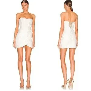 Elegant strapless lace dress. Features intricate floral patterns. Perfect for weddings.