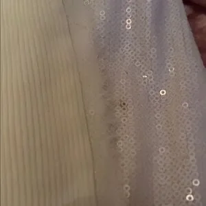 Beautiful white sequin and pleated shift dress with distressed edges which adds a carefree feel to an otherwise fancy dress. Small mark on the back (which may come out if dry cleaned. Not sure)