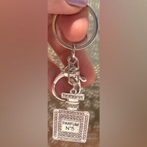 Elegant silver keychain with Parfum No. 5 charm. Perfect accessory for any bag or keys.