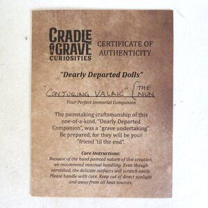 New, oddity doll by Cradle to Grave Curiosities. It is a hand crafted upcycled, scary, horror, porcelain doll. Entitled “Conjuring Valak (The Nun)” from the movie of the same name. This is from their “Dearly Departed Doll” series. Comes with Certificate of Authenticity and tag. She comes with a plastic cover that sits on the base. But she can be removed from her stand and be put on another. This was acquired from an Oddities convention. A talented artisan was selling their spectacular creations in their booth. This item has never been displayed. Perfect for Halloween decor or everyday. (See photos for details) I am the original owner. It has been in climate controlled storage since purchased. Comes from a pet and smoke free home.
