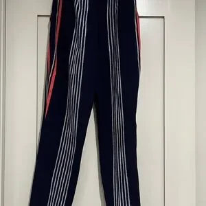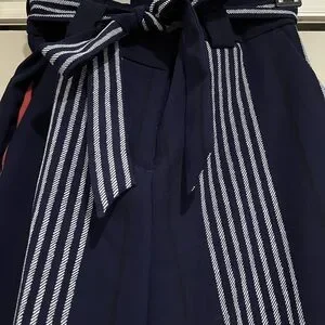 Stylish navy pants featuring vertical stripes and a matching belt. Perfect for a chic work attire