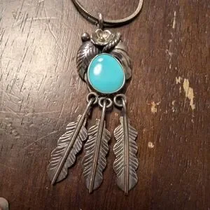 Sterling silver turquoise pendant with feather accents. Perfect for adding a touch of bohemian style to any outfit.