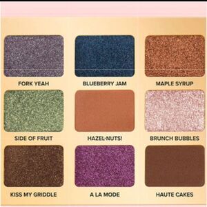 - 18 x 0.037 oz/ 1 g shades in Powdered Sugar (Pale Pink with Silver Pearl Satin Sparkle), Breakfast in Bed (Lavender with Blue & Silver Pearl Shimmer), Flapjack (Muted Mauve Brown Matte), Fork Yeah (Gunmetal Blue Grey Metallic), Blueberry Jam (Deep Navy-Blue Satin) Maple Syrup (Copper Brown Metallic), Serve Hot (Deep Burgundy Red Metallic), Get Sticky (Light Rose Gold Metallic) Sleepin' In (Bridal Pink Metallic), Side of Fruit (Lime Green Metallic) Hazel-Nuts! (Caramel Brown Matte), Brunch Bubbles (Silvery Champagne Shimmer), Short Stack (Cool Toned Brown Matte), Cup O' Joe (Black with Gold Pearl Matte with Shimmer), Morning Matcha (Bright Olive Satin), Kiss My Griddle (Brown with Multicolored Pearl Shimmer), A La Mode (Lavender Metallic), Haute Cakes (True Rich Brown Matte)