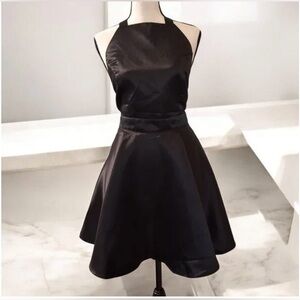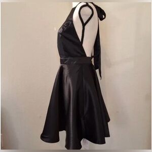 Elegant black sleeveless dress. Flared skirt design with bow, pockets, and open back. Perfect for an occasion or party!