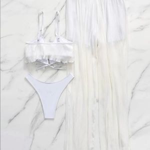 White, cute, ruffle, tie top, high cut, wireless bra, 3 piece set, high stretch, chiffon, removable padding,lined.