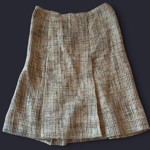 Tan, black, and cream tweed fabric. Zipper is in perfect condition. Skirt is lined.