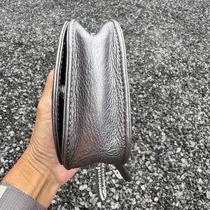 Edgy meets chic in this Rebecca Minkoff crossbody bag. Crafted in metallic silver leather, it features bold oversized and mini studs across the flap for a statement look. Finished with a silver-tone chain strap and snap closure. Signature Rebecca Minkoff striped fabric lining inside with logo plate.