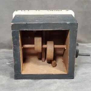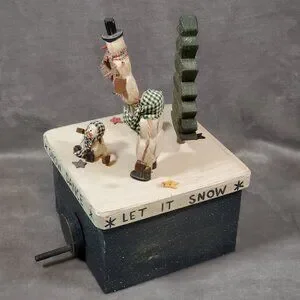 This is a vintage, handcrafted wooden toy in excellent condition - watch the snowmen dance & twirl around as you turn the hand crank. Works great, as seen in video, and comes from a smoke free home. Measures 9 1/2" x 8" x 6 1/2".
