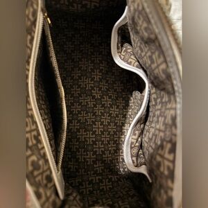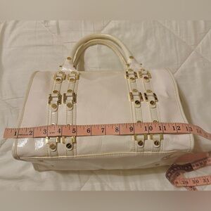 Vintage and one of a kind patent leather Tory Burch Robinson ivory color handbag with gold tone accents