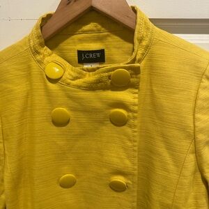 This is a J.Crew Women’s Double-Breasted Coat in a bold, vibrant yellow. Featuring a structured silhouette, it comes with a high collar, large tonal buttons in a double-breasted design, and front flap pockets for both function and style. The coat also includes button-tab cuffs and tailored seaming for a polished, fitted look. Perfect as a statement piece, this coat adds a pop of color to any outfit while offering warmth and timeless sophistication.