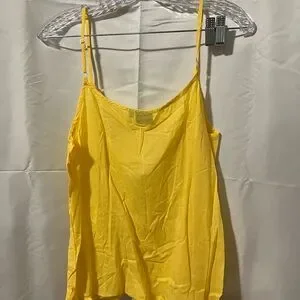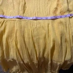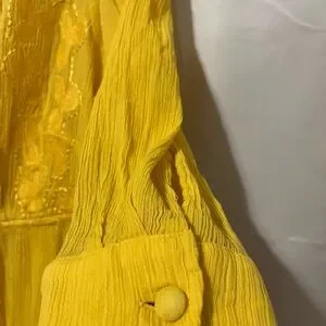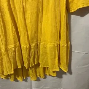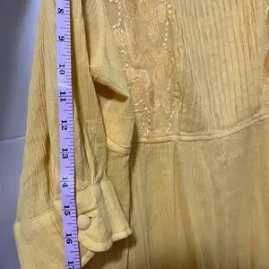 Bright yellow tunic dress with intricate embroidery. Features a flowy design and three-quarter sleeves.