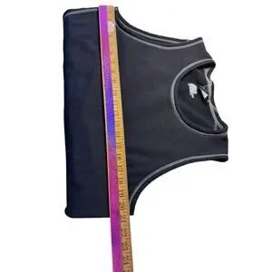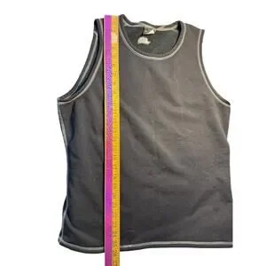 Pre-owned men’s fleece tank top in black with gray contrast stitching and embroidered logo detail on front and back. Designed with a sleeveless cut, soft fleece interior, and flatlock seams for comfort and durability. Great for layering, workouts, or casual outdoor activities.