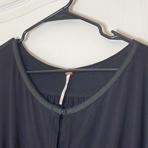 Free People Black Keepin On Top. Ties at cuffs on sleeves. Wide spaced button on front of blouse to provide the peek a boo effect with a beautiful bralette underneath. 3/4 sleeves. Keyhole opening. Hi low hem line. Worn once or twice. Generously sized. Excellent condition. Size medium. Would fit a Large as well.