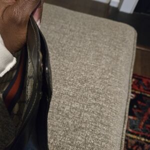 Elegant Gucci clutch featuring classic GG pattern. Beige and navy design with striking red stripe accent.