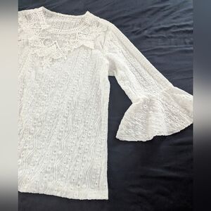 White Lace Women's Top, XXL (22.5' pit to pit, 27' length). Semi-sheer, intricate detail, round neck, flare cuffed sleeves, stretch.