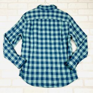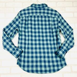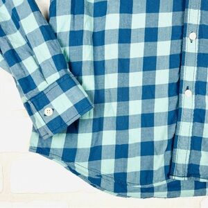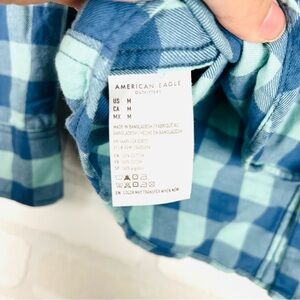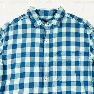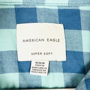 AMERICAN EAGLE MEN BLUE SLIM FIT EVERYDAY BUTTON-UP SHIRT, Super Soft Size Med. Elevate your casual wardrobe with American Eagle`s blue check button-up shirt. Expertly crafted from soft and breathable cotton, it is perfect for easygoing get-togethers or night outs. This shirt features regular cuffs which blend seamlessly with formal outfits and complement casual ones. The check pattern brings out your fashion-forward side, while the quality guarantees comfort for all-day wear. Upgrade your style and feel confident with this versatile and stylish button-up shirt. 22.25” chest, 29” length. #808 8
