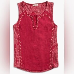 This eclectic v-neck tank features an embroidered woven gauze front with a floral & paisley printed slub knit back.