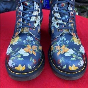 Dr. Martens Slate Blue Gray Darcy Floral Boots. Unique slate blue / gray with a bold multi floral pattern in red, golden yellow, blue, green, pale pink and white. Tall 14 eye boots. Interior side zips. These are in great, gently preloved condition❣️ Super clean inside and out. A few very light scuffs.