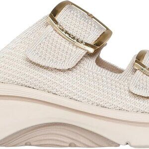 Features: These mesh slide sandals are designed for ultimate comfort with a patented contoured footbed and podiatrist-certified arch support. The double-band upper made of quick-drying knit is lightweight and super breathable. The adjustable buckle makes them easy to slip on and get a snug fit. Plus, they dry 30% faster — ideal for pool days, errands, or casual outings.