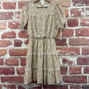 ▪️ Women’s Bohemian Prairie Style Dress: Scoop neckline, pullover, cottage floral vine pattern, lace trim, tiered look, ruffles, lining, and short ruffle sleeves. Pre-owned. Wear it with your favorite flats or heels!